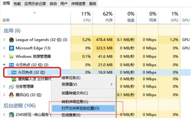 在今日热点弹窗弹出来之后,我们在键盘上同时按下“Ctrl+Alt+Del”键,调出“任务管理器”,在任务管理器进程找到“今日热点”,我们右键点击“今日热点”选择“打开文件所在的位置”,如下图所示。
