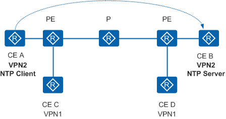 NTP服务在VPN网络的应用如图4-9所示。CE A和CE B同属于VPN2。CE B作为NTP单播服务器,CE A作为NTP单播客户端,两者可实现NTP时间同步。