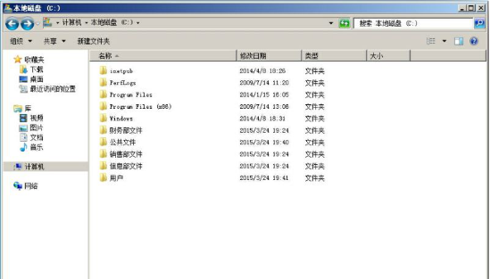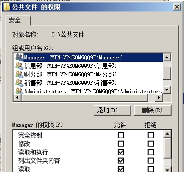 1.在文件服务器上创建三个文件夹分别存放各部门的文件,并要求只有本部门的用户能访问其部门的文件夹(完全控制的权限,本部门的用户为此文件夹的所有者),每个部门的经理和公司总经理可以访问所有文件夹(读取),另创建一个公共文件夹,使得所有用户都能在里面查看和存放公共的文件