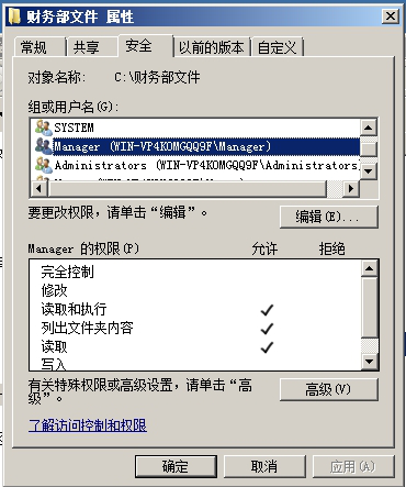 (7)设置财务部文件的所有者为财务部组,财务部组有完全控制权限
