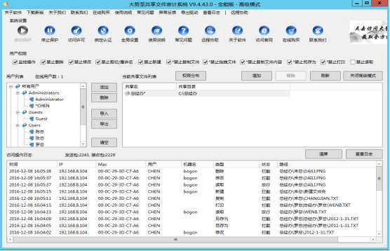 是一款专门的共享文件夹访问日志记录软件、服务器共享文件访问权限设置软件,可以实现只让读取共享文件而禁止复制共享文件、只让打开共享文件而禁止另存为本地和禁止拖拽共享文件以及只让修改共享文件而禁止删除共享文件,保护服务器共享文件安全,防止共享文件越权访问。 |