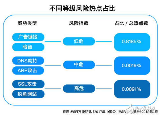 2017年公共WiFi安全报告已经出炉,报告表示一线城市的风险WiFi是0.81%,二线城市风险WiFi是0.82%,但是相比三线以下城市,一二线城市WiFi更安全,同时也揭露出餐饮美食场景下的风险热点的比例是最高的。