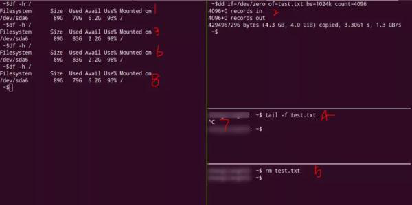 在介绍如何找回被删除的文件前,先来介绍一个运维经常会遇到的删除了文件,但磁盘空间不释放的问题。下图是一个模拟的例子,当 test.txt 文件被 tail -f 命令使用时,rm test.txt 并不会释放空间,当将 tail -f 命令 ctrl+c 中止后,磁盘空间才释放。