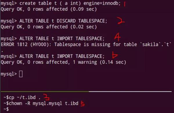 笔者在操作的时候使用的账号不是 MySQL 账号,导致第 4 步在引入表空间的时候提示表空间不存在,修改文件属主再重新导入就可以了。提醒大家还是要沉着,不要忙中出错。