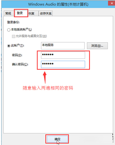 5.还是在Windows Audio的属性窗口中,点击切换到“登录”项,然后修改此账户的密码,任意输入两遍相同的密码即可(如:123456)点击“确定”进入下一步操作;