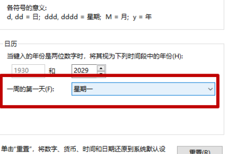 5、最后在该页面中在一周的第一天右侧设置选择“星期一”选项即可。