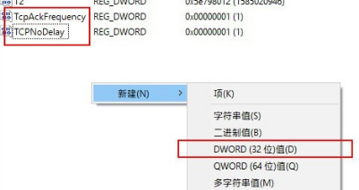 依次命名为“TcpAckFrequency”和“TCPNoDelay”,键值全部设为“1”。