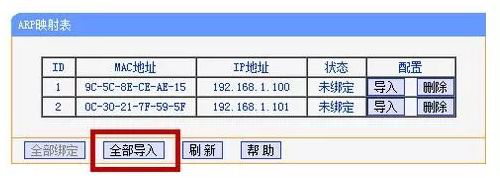 如果是在公司里面绑定大范围的电脑和手机的话,那么我们可以点击下面的ARP映射表,先将所有PC连接到该路由下面的网络并且开启,然后点击全部导入就可以。