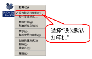 “开始”->“设置”->“打印机”->鼠标右键点击相应的打印机图标à 将“设为默认打印机”选中,如图(1);