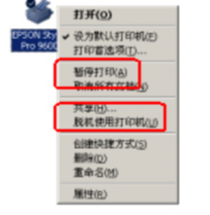 “开始”->“设置”->“打印机”->鼠标右键点击相应的打印机图标à查看是否将打印机设置为“脱机使用打印机”或“暂停打印”,前面的“√”,则表明已选中。如图(2);