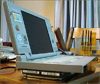 Libretto 50的硬盘采用后盖固定的方法,取掉后盖以后,因为本体的重量,使机身显得比较危险。考虑到硬盘的接合处可能会松脱或扭曲,最好是在硬盘另一侧使用适当的支撑物。在这个状态下使用外置软驱启动Windows95,尝试使用FDISK进行分区。假如Libretto 50具有可以认出超过8.4GB容量的硬盘的BIOS,那必定可以用FDISK来分配硬盘的所有容量。