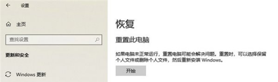 1) 打开“设置-更新和安全-恢复”,点击“重置此电脑-开始”;