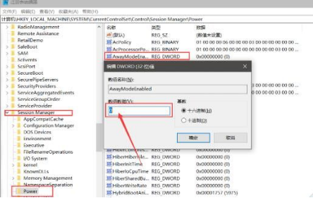 3、在右侧找到AwayModeEnabled ,如没有的话可以新建一个DWORD 32位值,然后设置数值为0