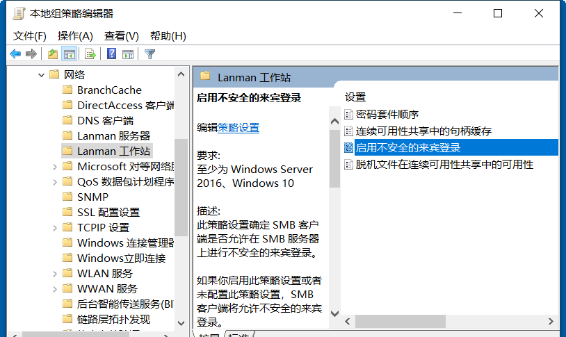 6、点击“Lanman工作站”在本地策略编辑器的右侧,可以找到“启用不安全的来宾登录”如下图
