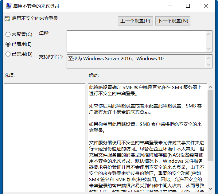 7、双击“启用不安全的来宾登录”。选择“已启用”,并点击确定后就可以访问啦。如下图