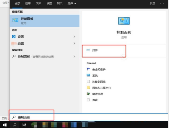 1、点击任务栏的搜索控制面板,然后我们就可以找到并打开了。
