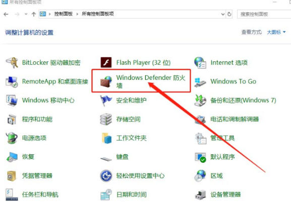 2、在控制面板中,我闪可以选则大图标或是小图标方式查看,然后点击Windows Defender 防火墙;