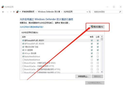 4、路径:控制面板 - 所有控制面板项 - Windows Defender 防火墙 - 允许的应用,允许应用通过 Windows Defender 防火墙进行通信(若要添加、更改或删除所允许的应用和端口,请单击更改设置),点击更改设置,再点击允许其他应用;