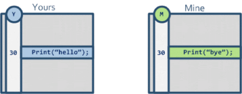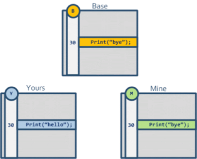 所以我们需要三向合并,所谓三向合并,就是找到两个文件的一个合并 base,如下图,这样子 Git 就可以很清楚的知道说,对方修改了这一行代码,而我们没有修改,自动帮我们合并这两个文件为 Print("hello")。