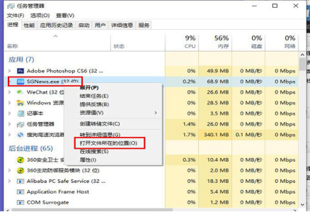 我们在弹出搜狗头条新闻之后,先不要将其关闭,我们在键盘上同时按下“Ctrl+Alt+Del”键,调出“任务管理器”,在任务管理器进程找到“头条新闻”,进程名为“SGNews.exe”,鼠标在此进程上右键点击选择“打开文件所在的位置”,如下图所示。