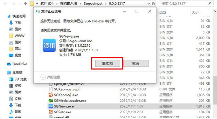 如果遇到文件正在使用无法删除,我们需要将搜狗头条新闻的弹窗关闭之后,点击重试或者重新删除操作即可。