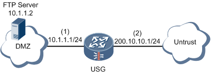 如图7-99所示,某企业内部网络的两个安全区域通过USG连接,其中DMZ区域部署了一台FTP Server供Untrust区域用户访问。FTP Server的实际IP地址为10.1.1.2,对外公布的地址为200.10.10.1,端口号均为缺省值21。由于外网环境复杂,不方便在服务器上设置回程路由,所以通过配置NAT Inbound,使服务器缺省将回应报文发给USG,以完成回应报文的正常转发。