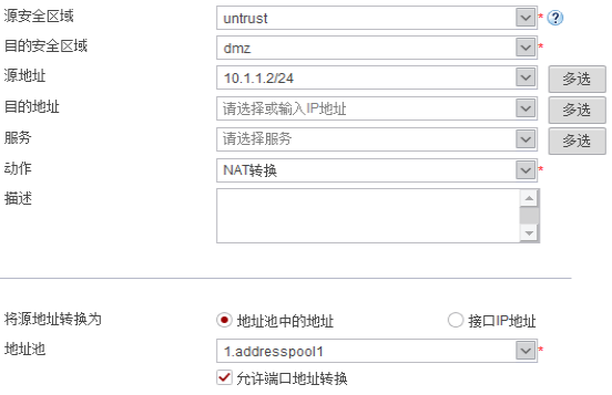 此处配置的源NAT是指对访问目的地址为10.1.1.2的报文源地址转换。