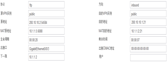 Untrust安全区域的用户(以200.10.10.2为例)可以正常访问FTP Server的FTP服务,选择“防火墙 > 监控> 会话表”,查看会话表详细信息如图7-104所示。