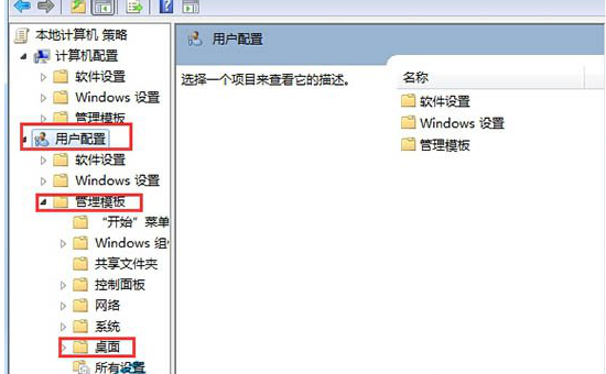 3、在打开本地组策略编辑器,在左边菜单列表里面依次点击并打开:“用户配置==》管理模板==》桌面”,打开关于桌面的设置菜单列表。如下图所示:
