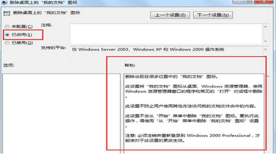 5、在“删除桌面上的我的文档图标”设置窗口中当前功能是已启用的,所以在桌面等位置看不到我的文档。如下图所示: