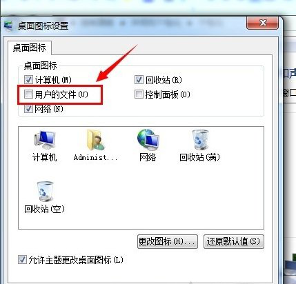 4、我们在桌面图标,勾选“用户的文件”即可在桌面上显示我的文档,此外我们还可以勾选添加“计算机”、“回收站”、“网络”、“控制面板”等。如下图所示:
