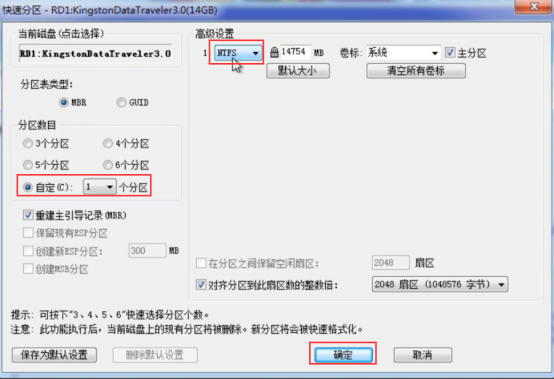 (4)弹出的框,再选自定义一个区,再把高级设置的格式设置为NTFS。U盘里的文件拷贝出来就点确定。再弹出的框点是。