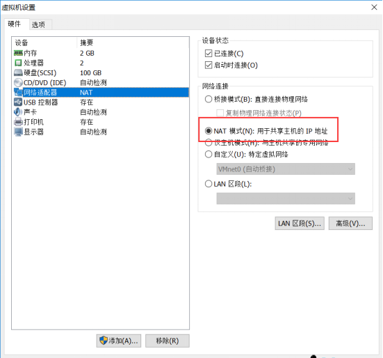 CentOS 7为例,因为Linux是安装在在虚拟机中,这里先看一下虚拟机的网络适配器: