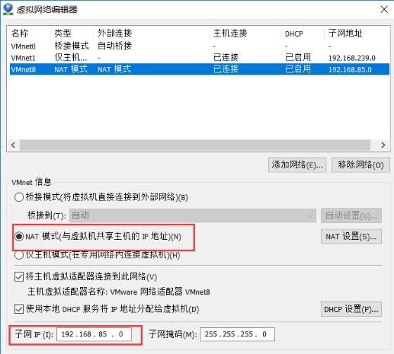 这里我使用的NAT模式,接着配置虚拟机的虚拟网络: