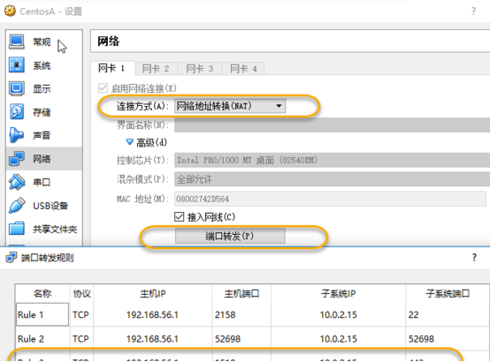如果是NAT连接的虚拟机,需要进行端口映射。本实验使用的VirtualBox 搭建的虚拟机,以此为例,按下图进行设置即可。