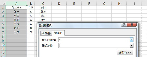 以上面这张表格为例,所有的员工姓名前面都多出了一个工号,同时还用一个短横杠与姓名连接起来。想要取消这个工号,可以借助Excel中的“查找与替换”功能批量修改。具体方法是:选中要处理的字段,按下Ctrl+F调出“查找与替换”对话框,然后在“查找内容”栏输入“*-”,“替换为”一栏保持空白,接下来点击“全部替换”就可以了。