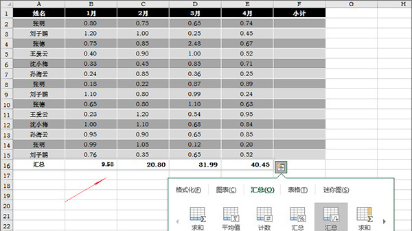 制表时常常会涉及到行列汇总,很多网友的做法是利用SUM函数或者“开始”→“编辑”菜单下面的“自动求和”命令加以实现。其实Excel中还有一个更快捷的方法,只要先选中要汇总的行或列,点击右下角弹出的“快速分析”按钮,继续选择“汇总”标签,这时表格下方就会模拟弹出一条汇总行,支持求和、平均值、计数、百分比汇总等计算,点击完成添加。此外我们也可以借助这个面板实现右侧区汇总,只要点击面板后面的按钮即可。。