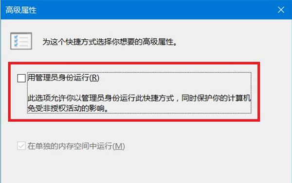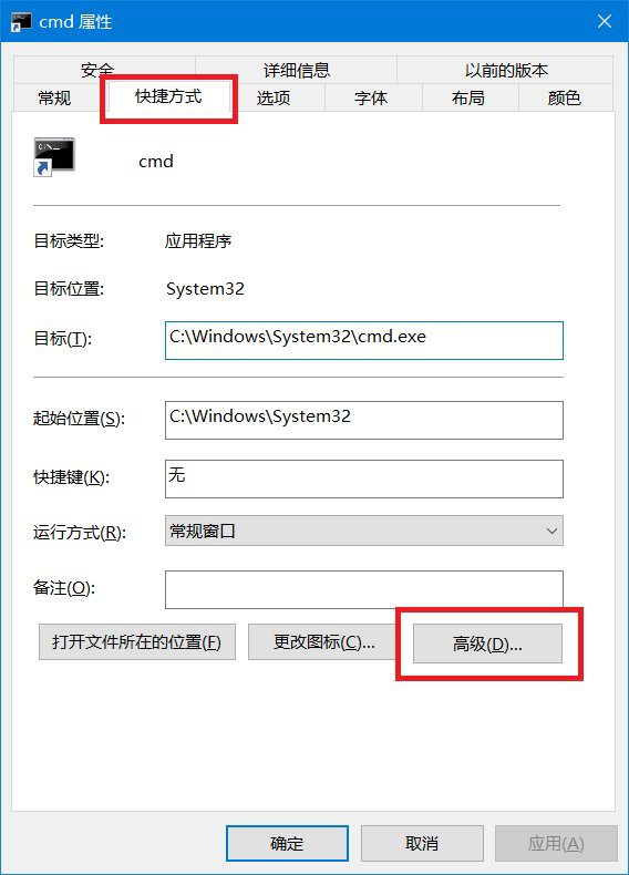 第三步:确认无误后,请右键打开该快捷方式的”属性“,找到”高级(D)…”按钮并点击,在弹出的窗口中勾选“用管理员身份运行(R)”。 -