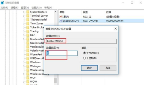 3、点击MTCUVC项,在右侧新建一个名为“EnableMtcUvc”的DWORD(32位)值,将其数据数值修改为“0”,点击确定;