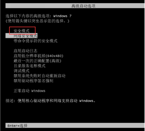 1,启动电脑,在屏幕出现Windows标徽时快速的按住键盘上的F8键不放进入“高级选项”界面,选择“安全模式”进入。