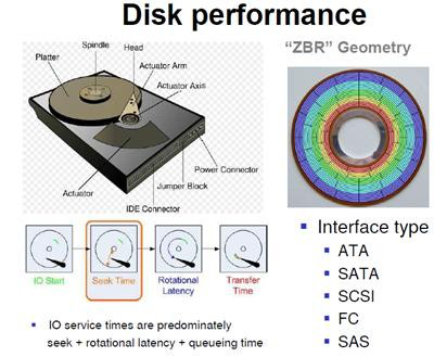 对于磁盘来说一个完整的IO操作是这样进行的:当控制器对磁盘发出一个IO操作命令的时候,磁盘的驱动臂(Actuator Arm)带读写磁头(Head)离开着陆区(Landing Zone,位于内圈没有数据的区域),移动到要操作的初始数据块所在的磁道(Track)的正上方,这个过程被称为寻址(Seeking),对应消耗的时间被称为寻址时间(Seek Time);但是找到对应磁道还不能马上读取数据,这时候磁头要等到磁盘盘片(Platter)旋转到初始数据块所在的扇区(Sector)落在读写磁头正上方的之后才能开始读取数据,在这个等待盘片旋转到可操作扇区的过程中消耗的时间称为旋转延时(Rotational Delay);接下来就随着盘片的旋转,磁头不断的读/写相应的数据块,直到完成这次IO所需要操作的全部数据,这个过程称为数据传送(Data Transfer),对应的时间称为传送时间(Transfer Time)。完成这三个步骤之后一次IO操作也就完成了。