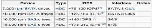 另外,对于同一个磁盘(或者 LUN),随着每次 I/O 读写数据的大小不通,IOPS 的数值也不是固定不变的。例如,每次 I/O 写入或者读出的都是连续的大数据块,此时 IOPS 相对会低一些;在不频繁换道的情况下,每次写入或者读出的数据块小,相对来讲 IOPS 就会高一些。也就是说,IOPS 也取决与I/O块的大小,采用不同I/O块的大小测出的IOPS值是不同的。 对一个具体的IOPS, 可以了解它当时测试的I/O块的尺寸。并且IOPS都具有极限值,表1列出了各种磁盘的 IOPS 极限值。