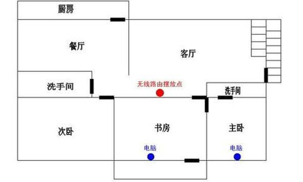 由于目前大多数家用无线路由器的天线增益为5dBi,将无线路由器摆放在居室的中心点,就能让用户在各个房间,都可以体验很好的无线网络。