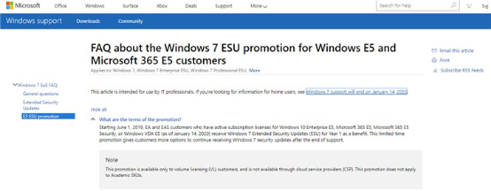 今天微软再度宣布了一项新的优惠措施:拥有Windows 10 Enterprise E5,Microsoft 365 E5,Microsoft 365 E5安全性或Windows VDA E5的有效订阅许可证的EA和EAS客户(截至2020年1月14日)将获得Windows 7 Extended免费的一年级安全更新。值得注意的是这是微软官方的一次限时促销活动且仅适用于通过EA或EAS协议购买的批量许可客户。