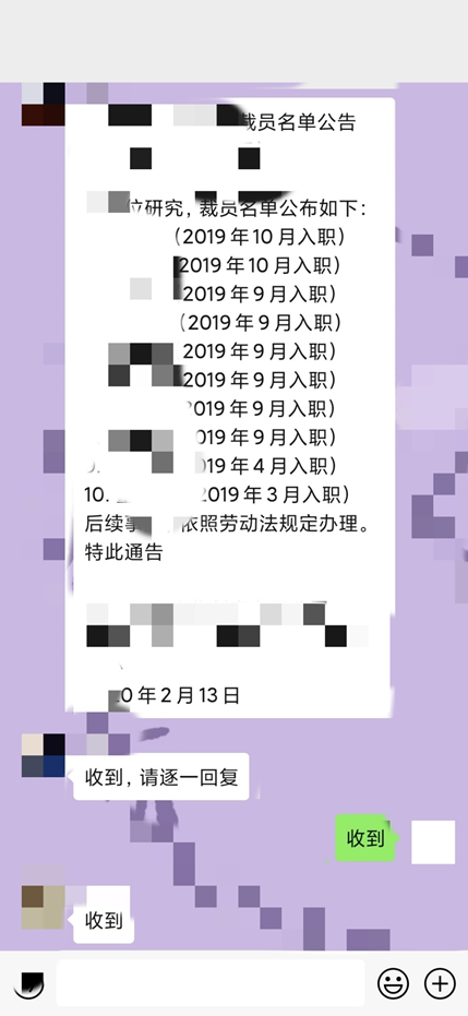 公司一共裁了十个人,八个人乖乖地自己写了辞呈,两个人没写。然后我们这两个人,就等于得罪了老板。当时我们问,为什么公司不如实写裁员原因,没收到答复,随后就被迅速被清退了所有工作群。