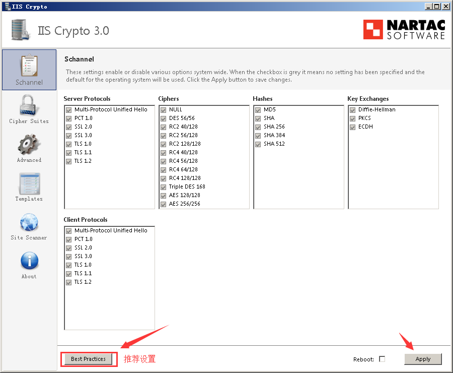 IISCrypto,下载该工具后,使用推荐配置即可完成安全设置,使用起来非常简单。