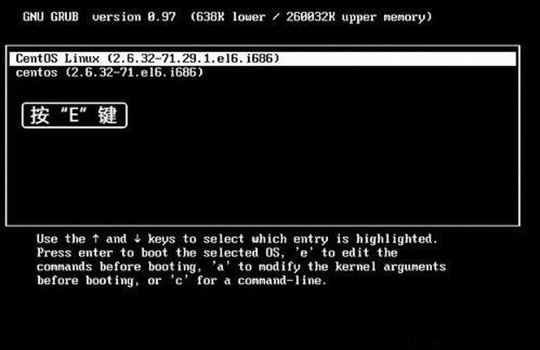 1、重启系统后出现GRUB界面在引导装载程序菜单上,用上下方向键选择你忘记密码的那个系统键入“e” 来进入编辑模式。
