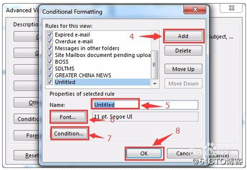 4、然后点击“Add”,新增自定义组,然后给这个组命名,老板的邮件组可以命名为“BOSS”“BIG BOSS”,哈哈,随你喜欢;然后点击Font,设置自定义标记的颜色、字体和字号;最后点击"Condition",设置自定义的条件。