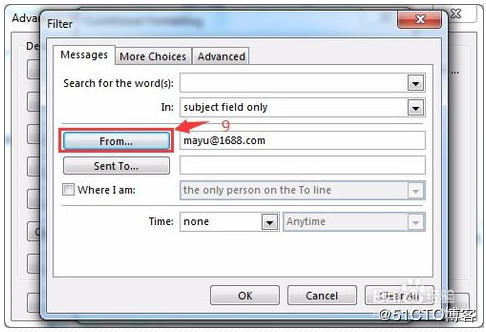 5、在弹出的对话框中,点击“From”选择要标记的邮件地址,或直接填入右边的对话框中,然后点击OK,一路OK到底就好了。