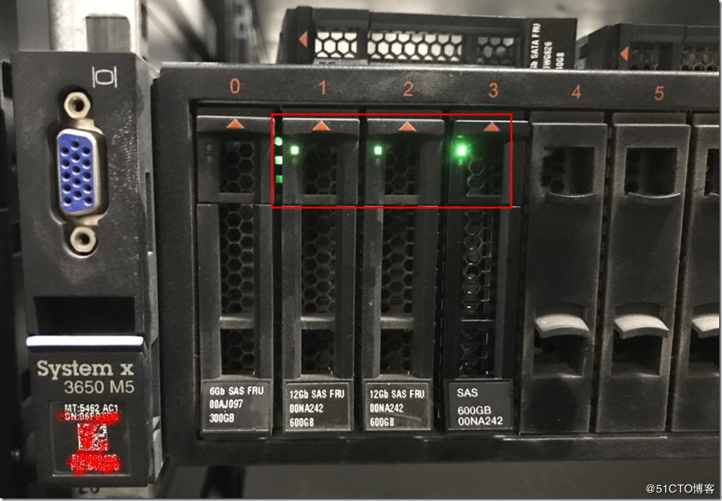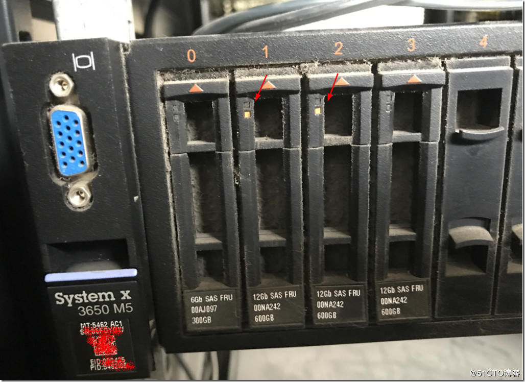 第三台服务器也是3650 M5,在另一个机房,槽位3的硬盘是年前换的,这个机房明显环境好一些,服务器硬盘上的灰尘也少一些,如图7所示。